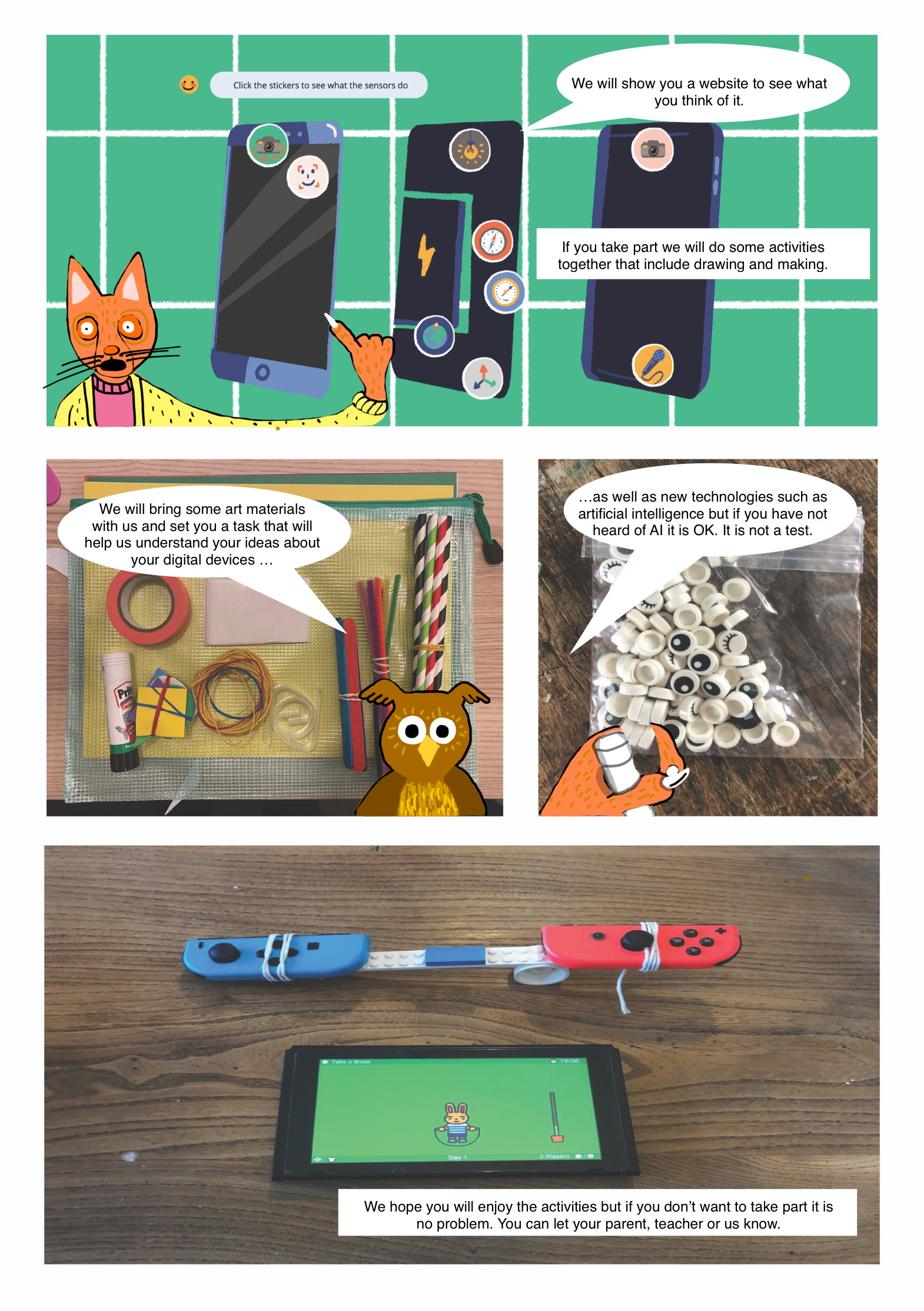 Graphic narrative drawn as an information sheet to invite children to participate in our Exploring Children’s Attitudes Towards Notions of Digital Good/Bad research project.