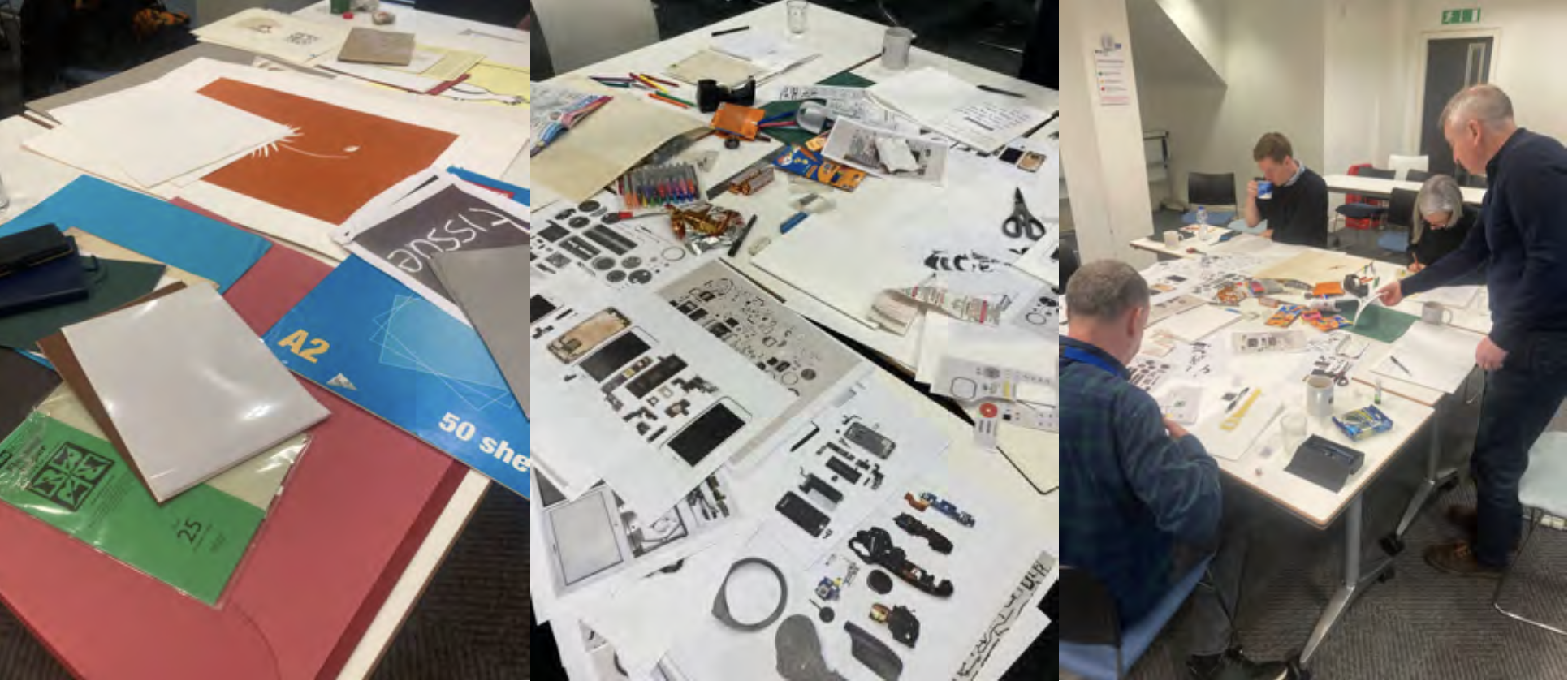 Images: Zine making workshop led by Richard NashThis outputs from this workshop were combined with the earlier visual prompts and materials from the literature review and networking events and then used by Richard Nash to produce four zines that the team then used in the research workshops with children (see below). Each zine has a different focus on smart phones, smart devices, AI and game consoles.