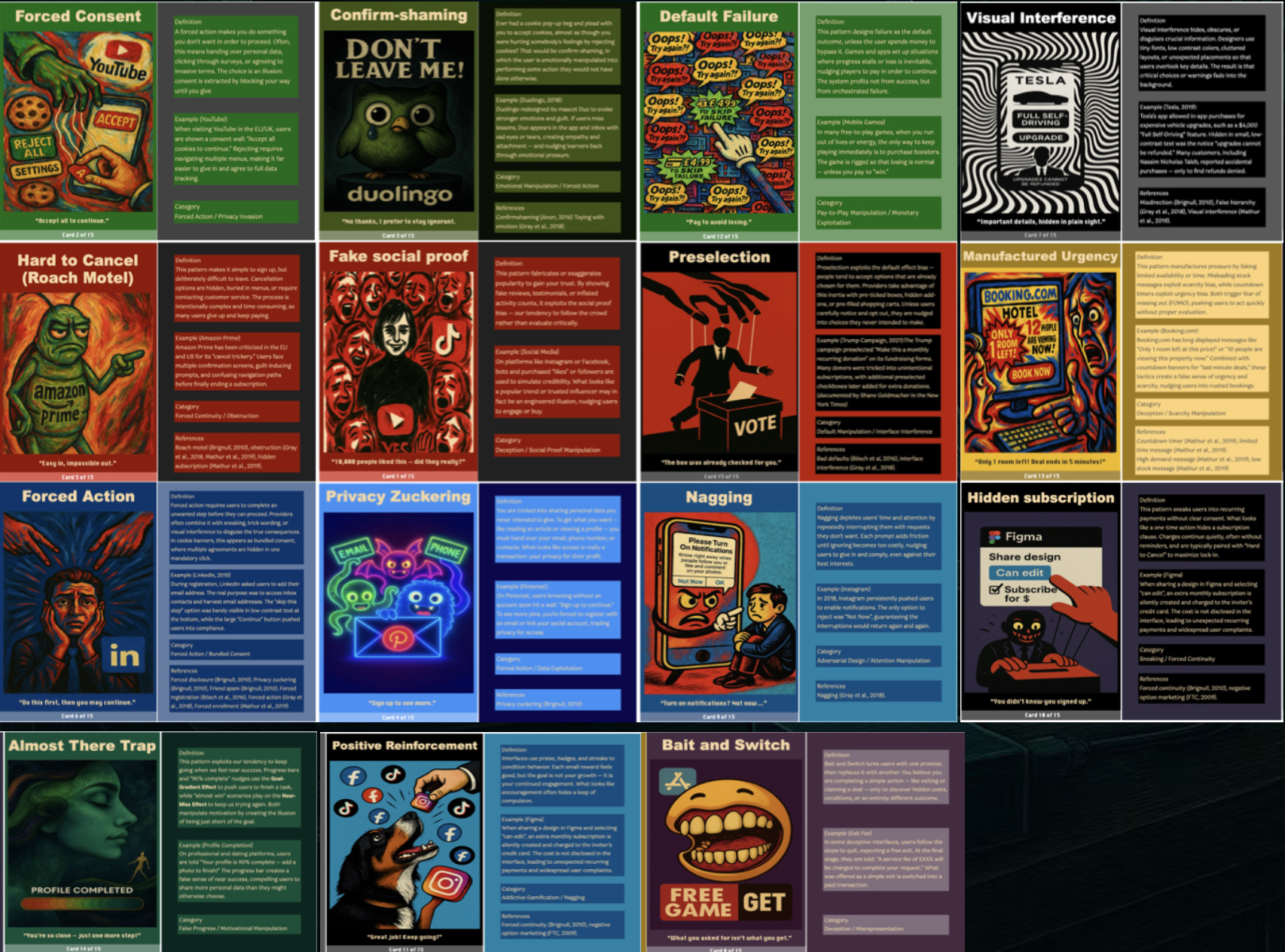 This in an interactive installation that aims to engage the user with notions of dark patterns embedded in digital platforms by making it impossible for the user to consent to the terms and conditions. It is accompanied by a series of cards that explain some of the dark patterns found in a range of popular digital platforms.