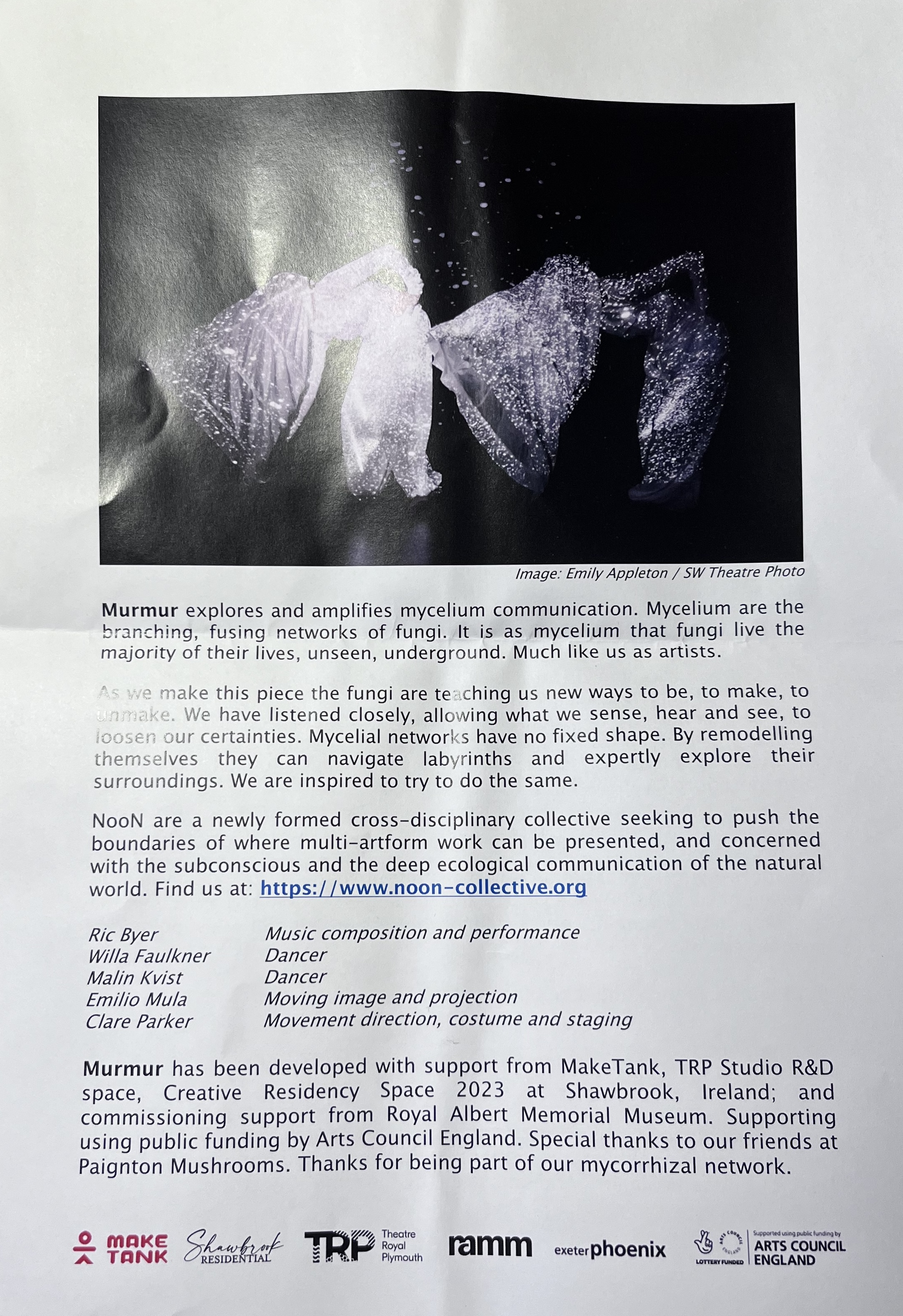 Plymouth Theatre Royal has two theatres and an experimental performance space and we attended shows to support studies into Experience Design. One of the shows Murmur also connected direct to one of the core readings related to more-than-human theories Sheldrake’s book on Fungi- Entangled Lives.